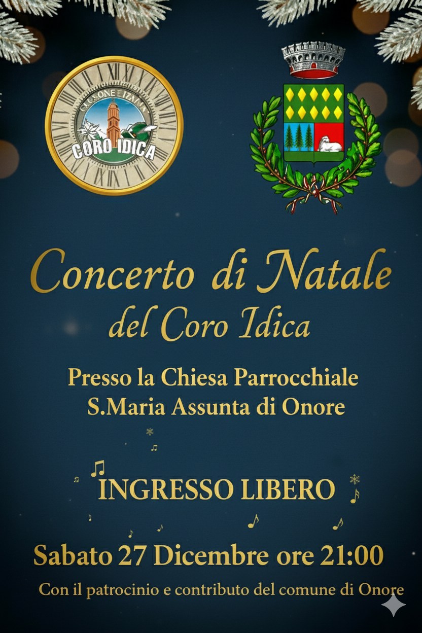 Lo storico Coro Idica di Clusone, in collaborazione con il Comune di Onore, vi invita a partecipare al concerto di Natale presso la Chiesa Parrocchiale S.Maria Assunta di Onore sabato 27 dicembre alle ore 21:00.