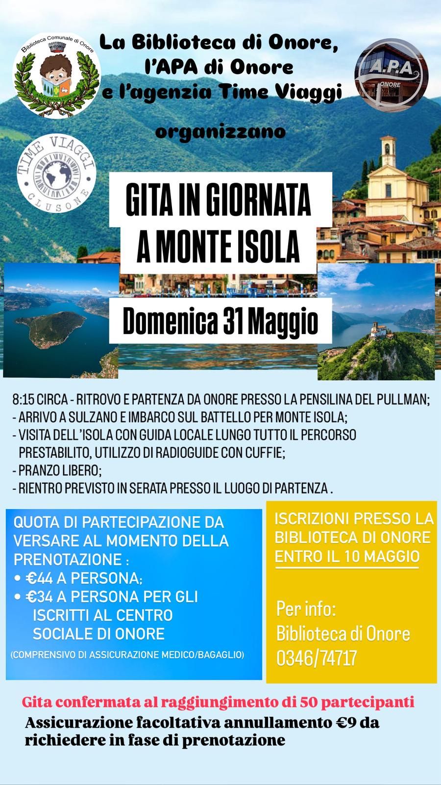 La Biblioteca di Onore, l’APA di Onore e l’agenzia Time Viaggi organizzano una gita in giornata a Monte Isola, in programma domenica 31 maggio.