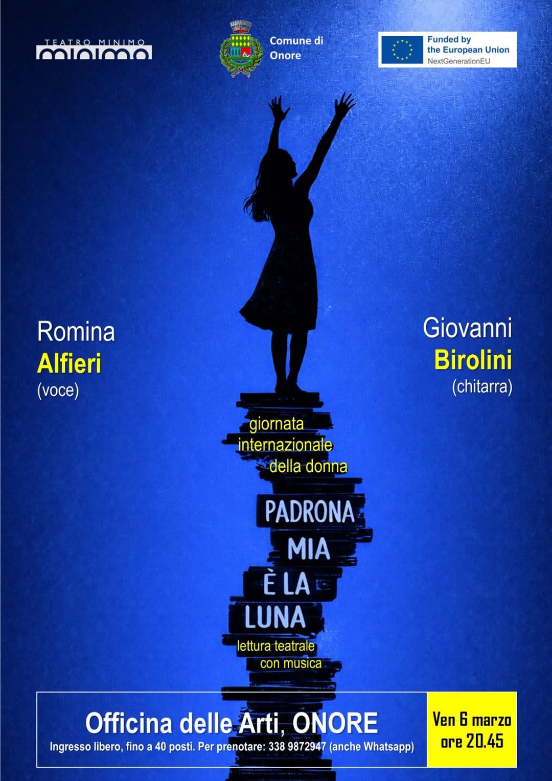 Venerdì 6 marzo alle ore 20.45 andrà in scena “PADRONA MIA É LA LUNA”, una lettura teatrale con musica che accompagna il pubblico in un percorso fatto di emozioni, riflessioni e immagini evocative. La voce di Romina Alfieri dialogherà con la chitarra di Giovanni Birolini, creando un’atmosfera intima e coinvolgente, capace di valorizzare la forza, la complessità e la profondità dell’identità femminile.