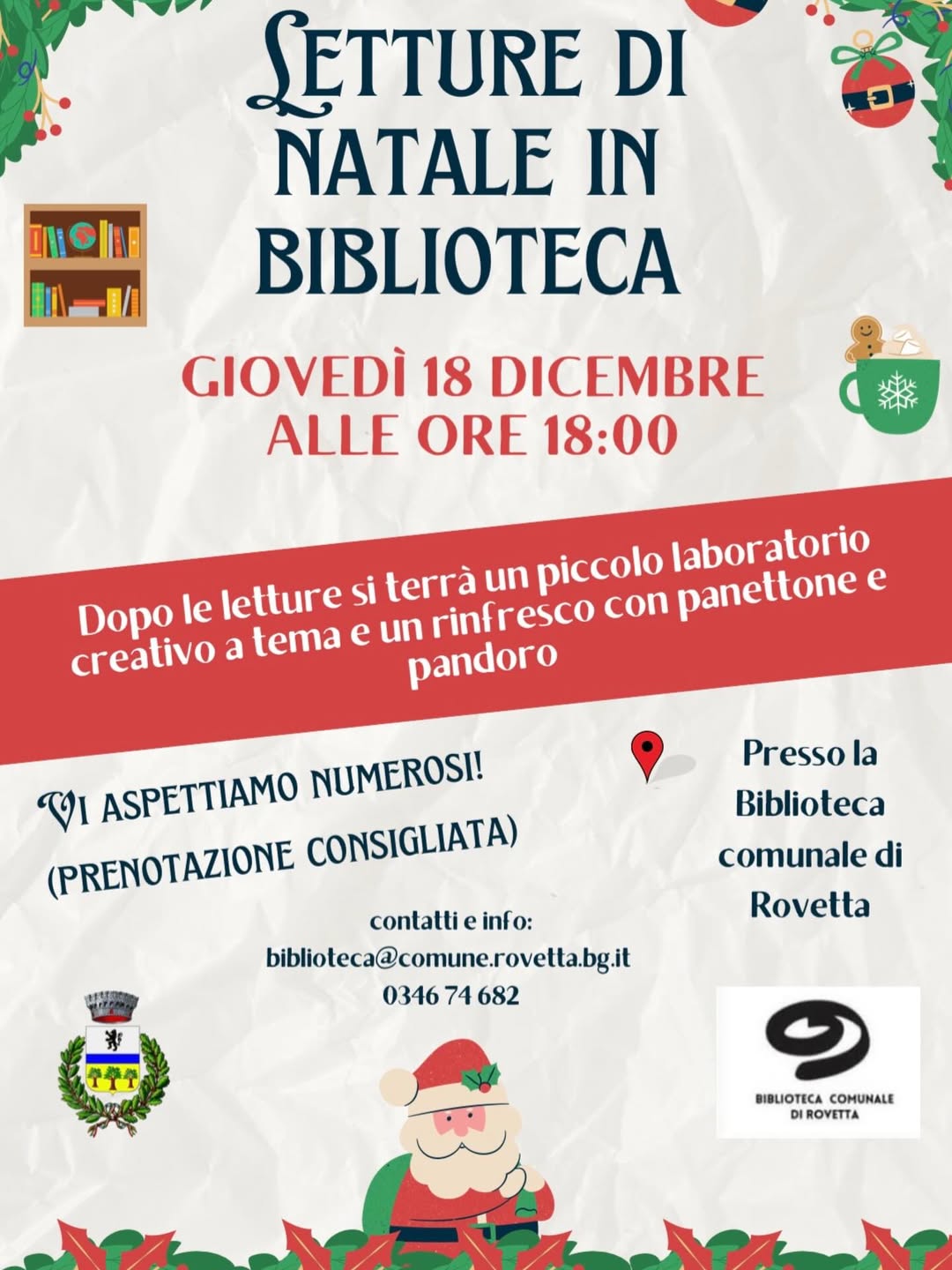 La Biblioteca di Rovetta vi aspetta giovedì 18 dicembre alle ore 18:00 per le letture di Natale in compagnia. Dopo le letture si terrà un piccolo laboratorio creativo a tema natalizio per tutti i bambini e per concludere un rinfresco con panettone e pandoro per augurare a tutti un sereno Natale.