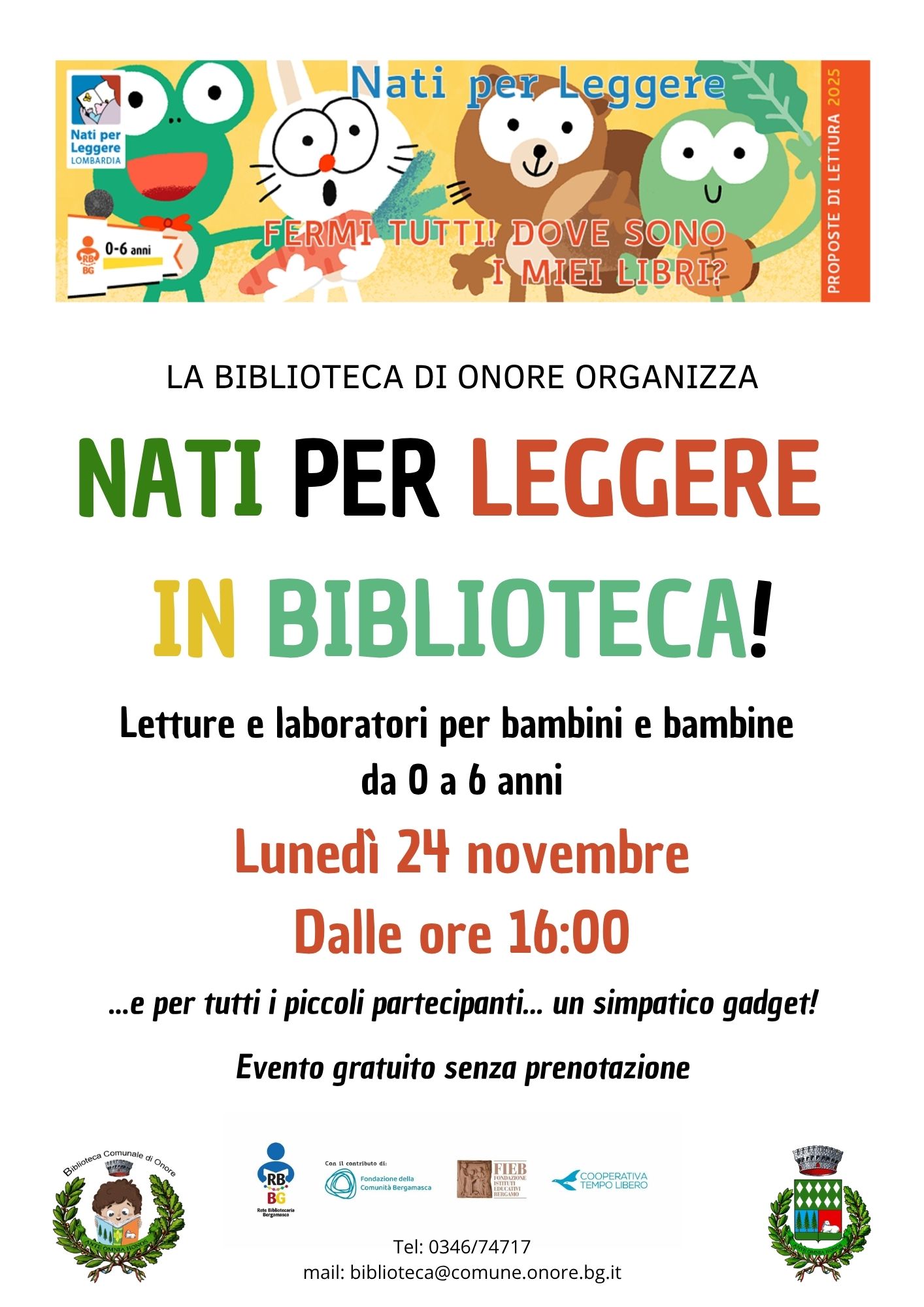 Un’iniziativa dedicata ai bambini e bambine dagli 0 ai 6 anni proposta dalla Biblioteca di Onore e dall’Ass.ne Nati per leggere in Lombardia. Lunedì 24 novembre non mancate a letture, laboratori e tanto divertimento presso la Biblioteca di Onore.