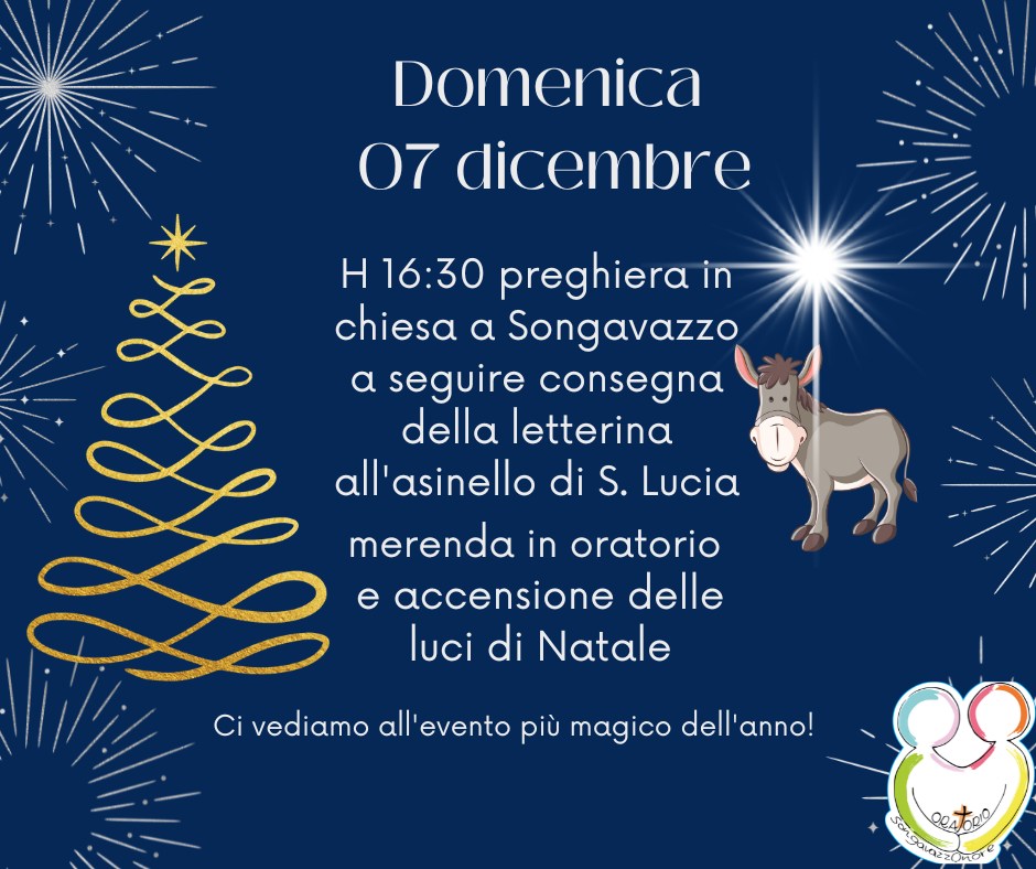 L’evento inizierà alle 16:30 con un momento di preghiera nella chiesa di Songavazzo, per poi proseguire con la tradizionale consegna delle letterine all’asinello di Santa Lucia.