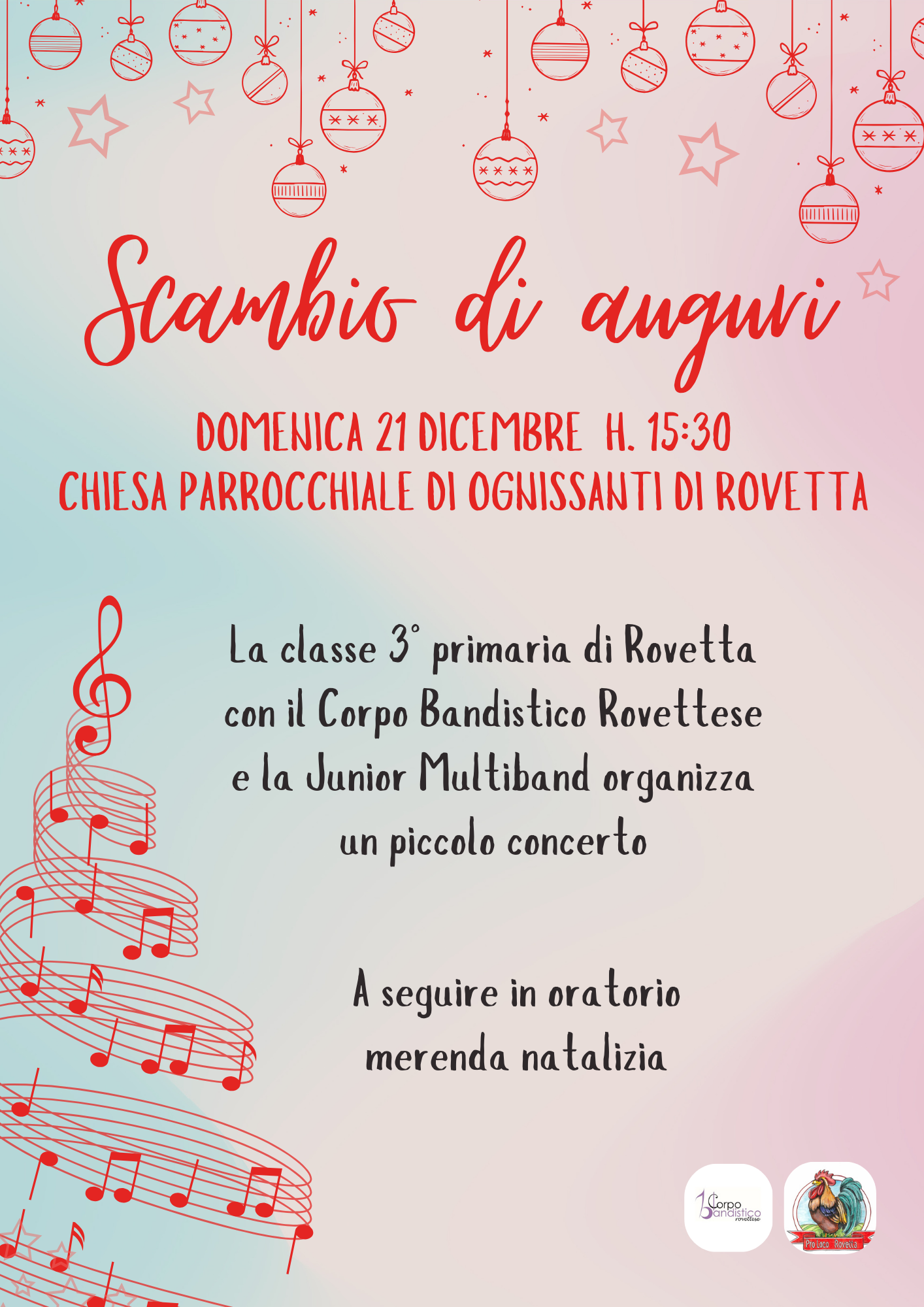 Domenica 21 dicembre il Corpo Bandistico Rovettese e la Junior Multiband organizza il saggio finale con i ragazzi delle classi terze della scuola primaria presso la Chiesa Parrocchiale di Rovetta alle ore 15:30.